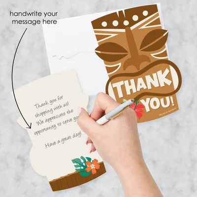 Shaped Thank You Cards Set INCLUDES 12 Tropical Luau Hawaiian Beach Party thank you cards and 12 premium white envelopes. Tiki Shaped Thank You Cards are the perfect end to any event. Tiki party thank you note cards SIZE 5 inches by 7 inches. The included envelopes measure to fit 5 inches by 7 inches cards. The back of each Tropical Luau party thank you has space to write a personal message of thanks. PREMIUM PARTY THANK YOU CARDS: Tropical Luau party thank you cards are professionally printed on heavy-duty cardstock paper with a photo-like shine. They are individually inspected, then carefully packaged with our exclusive squiggle flap envelopes, making this Tropical Luau stationery set a must-have for any Summer Party. MADE IN THE USA: Tropical Luau Party Thank You Cards are designed and manufactured at our Wisconsin facility using materials that are Made in America.