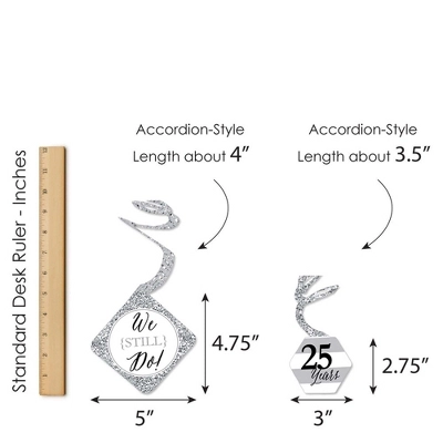 Party Decoration Swirls – Set of 40 INCLUDES 4 different shapes, 10 count per shape, that hang below an accordion-style spiral with included clear hooks. 10 swirls SIZE 5 inches x 5 inches with length about 11 inches. 10 swirls, SIZE 7.75 inches x 5.5 inches with length about 9 inches. 10 swirls, SIZE 5 inches x 4.75 inches with length about 4 inches. 10 swirls, SIZE 3 inches x 2.75 inches with length about 3.5 inches. PERFECT FOR ANY EVENT: With different hanging lengths and a variety of shapes and sizes, Party Decoration Swirls are perfect for anniversary parties. Add a pop of color when displayed over the gift table or dessert buffet. Or, add your own string if you would like them to hang lower in your party space. EASY TO USE: Each decoration swirl in the 40-piece set has a pre-cut hole for easy assembly using the included clear hooks. Party decoration swirls will arrive flat. Take a clear hook and insert the bottom bar into the pre-cut hole. Once the clear hook is fastened, gently stretch the swirl and hang it up. HIGH-QUALITY PARTY SUPPLY: We Still Do – 25th Wedding Anniversary Party Decoration Swirls are professionally printed and double-sided on heavy-duty cardstock paper. They are individually cut, inspected, and carefully packaged. Each swirl will use one clear hook. MADE IN THE USA: Party Decoration Swirls are designed and manufactured at our Wisconsin facility using materials that are Made in the USA. We Still Do – 25th Wedding Anniversary Party Decoration Swirls uses a No-Mess Glitter Print: Our party kits are designed with a printed image of glitter, eliminating glitter flake while maximizing bling effect!