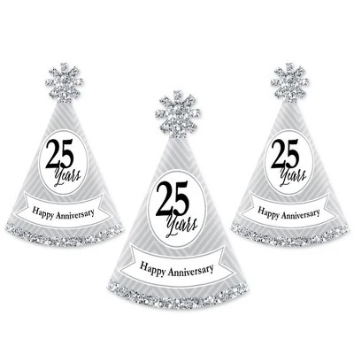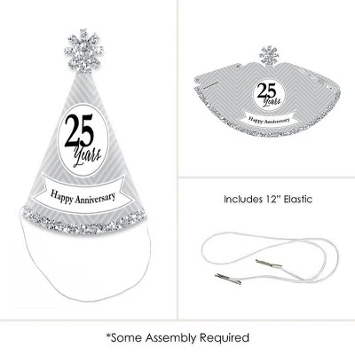 25th Wedding Anniversary Mini Party Hats INCLUDES 8 mini hats and 8 elastic chin straps. Mini wedding anniversary party hats will fit adults. Some assembly required. 8 – 25th Wedding Anniversary party hats SIZE4.75 inches tall and 3.25 inches in diameter at the base. The included elastic chin straps measure 12 inches long. These cute silver anniversary party accessories feature a unique star cut-out decoration at the top and the printed saying “Happy Anniversary”. FUN ANNIVERSARY PARTY ACCESSORIES: 25th Wedding Anniversary mini party hats are perfect for your silver anniversary party. This set of cute tiny party hats will help you take adorable wedding anniversary photos. Little party hats are sure to be enjoyed by all your friends and family! PREMIUM MINI PARTY HATS: Set of 8 25th Wedding Anniversary mini party hats are professionally printed on heavy-duty card stock paper with a photo-like shine. They are individually inspected, then carefully packaged. 25th Anniversary mini cone wedding anniversary party hats will arrive flat. Easy assembly is required. Simply roll the party hat into a cone shape, slide the tab into the slot to secure cone shape, and then attach the elastic strap. MADE IN THE USA: We Still Do – 25th Wedding Anniversary – Mini Cone Anniversary Party Hats are designed and manufactured at our Wisconsin facility using materials that are Made in the USA. 25th Wedding Anniversary Mini Cone Party Hats use a No-Mess Glitter Print: Our small cone party hats are designed with a printed image of glitter, eliminating glitter flake while maximizing bling effect! *Adult Use Only. Not for children under 13 yrs. This is not a toy. Not intended for children’s use.