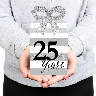 Bow Boxes INCLUDE: 12 25th Anniversary-themed square favor gift boxes. Each box SIZE measures 3.5 inches length x 3.5 inches width x 7 inches height. Bow boxes are ideal for small gifts and treats that are under 3.5 inches tall (height for storing items in closed box). When assembled and closed, each box creates a 3D paper bow-shaped top with a square bottom. CUTE GIFT BOXES: This small, closed favor box can be filled with homemade treats (fun cupcake box), party trinkets, or thank you gifts. At the party, have each guest fill their Refined, Grey, White and Silver Striped bow box with snacks from a candy buffet or use as a party loot box. Guests will have fun guessing what surprise each favor gift box contains. PREMIUM PARTY SUPPLY: Bow boxes are professionally printed and double-sided on heavy-duty cardstock paper, with a photo-like shine. They are hand-folded, individually inspected, and then carefully packaged. EASY ASSEMBLY: 25th Anniversary bow boxes will arrive flat. Each bow box has crease lines and numbered tabs for easy folding. Finish the DIY assembly by interlocking top of box to create a three-dimensional bow. Packaging will include assembly instructions. MADE IN THE USA: The Refined, Grey, White and Silver Striped 25th Anniversary Celebration bow boxes are designed and manufactured at our Wisconsin facility using materials that are Made in the USA. 25th Anniversary Party bow boxes use a No-Mess Glitter Print: Our DIY favor boxes are designed with a printed image of glitter, eliminating glitter flake while maximizing bling effect!