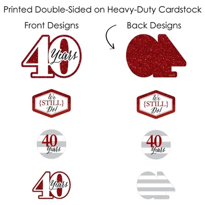 We Still Do – 40th Wedding Anniversary Showstopper Table Toppers INCLUDE: 35 heavy-duty paper centerpiece cut-outs in our We Still Do – 40th Wedding Anniversary theme. Each cut-out shape is printed double-sided and includes 35 wooden dowel sticks. DIY assembly is required. EASY TABLE DECORATIONS: We Still Do – 40th Wedding Anniversary showstopper party centerpieces come with a variety of fun shapes and in the perfect sizes to create impressive tabletop decorations. Place assembled centerpiece sticks into jars or floral arrangements for that showstopper wow-factor. DIY PARTY CENTERPIECES: We Still Do – 40th Wedding Anniversary party centerpiece kit arrives with wooden dowels and reinforcing stickers for easy DIY assembly. Simply press the included reinforcing sticker onto one dowel stick, near the end of dowel. Then, firmly press dowel to the back of a table topper shape. HIGH-QUALITY PARTY SUPPLIES: We Still Do – 40th Wedding Anniversary showstopper table toppers are professionally printed double-sided on sturdy cardstock paper with a photo-like shine. They are individually inspected and carefully packaged by hand. Showstopper table toppers will arrive unassembled, leaving your DIY anniversary party idea options endless. MADE IN THE USA: We Still Do – 40th Wedding Anniversary showstopper table toppers are designed and manufactured at our Wisconsin facility using materials that are Made in the USA. We Still Do – 40th Wedding Anniversary centerpieces decorations use a No-Mess Glitter Print: Our table topper decorations are designed with a printed image of glitter, eliminating glitter flake while maximizing bling effect!