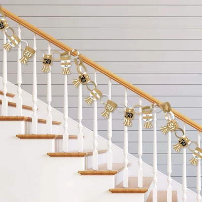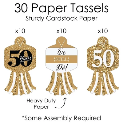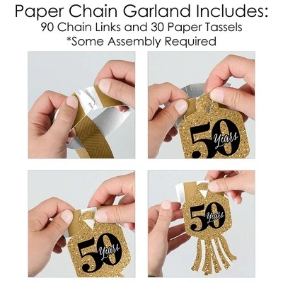 Paper Chains Garland INCLUDES: 90 paper chain links in 3 coordinating patterns and 30 paper tassels in 3 coordinating patterns. Completed paper chains garland measures approximately 21 feet, with some assembly required. One chain link SIZE 10 inches x 1 inch and one paper tassel SIZE 3 inches x 5.5 inches. SIMPLE ASSEMBLY: We Still Do – 50th Wedding Anniversary paper chain decoration kit will arrive flat and is easy enough for the whole family to assemble. First, form a chain link into a circle and insert the tab through the slit. Slide the next chain link through the first link and repeat until all chain links are connected, forming a paper chains garland. Attach paper tassels by inserting paper tassel through center slit located on the chain link. DIY PARTY SUPPLIES: Dress up all areas of your gold and black party with paper chains. Some fun decorating ideas are to wrap paper chains down a staircase railing, hang above doorways, or use as a photo booth backdrop. For an effortless look, stretch paper chains garland down the center of your dining room table. Paper chains can also be used to count down the days to a big event or trip. PREMIUM PARTY DECORATION: Paper chain decorations are professionally printed and double-sided on sturdy cardstock paper, with a photo-like shine. They are then individually cut, inspected, and carefully packaged. We Still Do – 50th Wedding Anniversary paper chains garland is a DIY kit that can be used in many ways. Get inspired with this fun do-it-yourself anniversary party decor kit! MADE IN THE USA: We Still Do – 50th Wedding Anniversary Party paper chains garland is designed and manufactured at our Wisconsin facility using materials that are Made in the USA. We Still Do – 50th Wedding Anniversary paper chains garland use a No-Mess Glitter Print: Our DIY party decorations are designed with a printed image of glitter, eliminating glitter flake while maximizing bling effect!