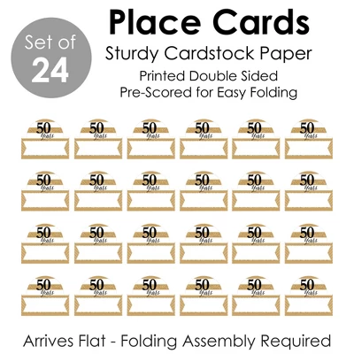 We Still Do – 50th Wedding Anniversary Place Cards INCLUDES 24 individual cards that measure 3.5β wide x 2.5β tall when assembled. Easy to use, these tabletop accents are perfect to use at your next Anniversary Party. VERSATILE IN USE: Whether itβs a small party or large gathering, the White & Gold Place Cards can be used in a variety of ways. Handwrite words in the blank space and then set them on the buffet table, as part of a place setting, or consider using them for an icebreaker activity. EYE-CATCHING DESIGN: Featuring crisp graphics with an innovative cut design, We Still Do – 50th Wedding Anniversary Place Cards will easily draw in attention without taking up too much space. To assemble, push back the top outer edge, revealing the half-circle top. Fold along the pre-scored line in the center to create the tent shape, and then display! HIGH-QUALITY: White & Gold Place Cards are professionally printed double-sided on sturdy cardstock paper with a photo-like shine. They are individually inspected and carefully packaged by hand. Place Cards will arrive flat with some folding assembly required. MADE IN THE USA: We Still Do – 50th Wedding Anniversary Place Cards are designed and manufactured at our Wisconsin facility using materials that are Made in the USA. We Still Do – 50th Wedding Anniversary Place Cards uses a No-Mess Glitter Print: Our Place Cards are designed with a printed image of glitter, eliminating glitter flake while maximizing bling effect!