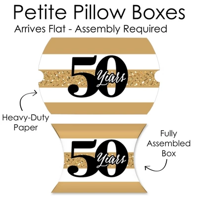 We Still Do – 50th Wedding Anniversary Petite Pillow Boxes INCLUDES 20 decorative boxes. Boxes arrive flat and require some easy assembly. Fiftieth Anniversary petite gift boxes come in a mini size, perfect for an Anniversary Party. FUN SIZE: We Still Do – 50th Wedding Anniversary Petite Pillow Boxes are SIZE 4 inches long x 3 inches wide. When fully assembled, boxes have a 1.25-inch wide opening on each end with a depth of 2.75 inches. Great for all ages, these boxes are ideal for storing bite-sized candy, jewelry, and other miniature gifts. SUPER EASY ASSEMBLY: Fiftieth Anniversary Petite Pillow Boxes require minimal assembly before use. Gently squeeze box open and fold one end, following numerical instructions inside each tab. Place gift inside or leave empty before folding the opposite end. PREMIUM GIFT BOXES: We Still Do – 50th Wedding Anniversary Petite Pillow Boxes are professionally printed on heavy-duty paper with a photo-like shine. Boxes are hand-folded flat with ends left untouched for easy customer assembly. They are then individually inspected and carefully packaged. MADE IN THE USA: We Still Do – 50th Wedding Anniversary Petite Pillow Boxes are designed and manufactured at our Wisconsin facility using materials that are Made in the USA. We Still Do – 50th Wedding Anniversary Petite Pillow Boxes use a No-Mess Glitter Print: Our Pillow Boxes are designed with a printed image of glitter, eliminating glitter flake while maximizing bling effect!