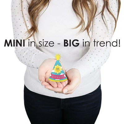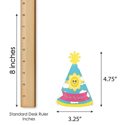 You Are My Sunshine Mini Party Hats INCLUDES 8 mini hats and 8 elastic chin straps. Mini baby shower or birthday party hats will fit both children and adults. Some assembly required. 8 You Are My Sunshine party hats SIZE 4.75 inches tall and 3.25 inches in diameter at the base. The included elastic chin straps measure 12 inches long. These cute sunshine yellow party accessories feature a unique star cut-out decoration at the top and the printed saying “You Are My Sunshine”. FUN SUNSHINE PARTY ACCESSORIES: You Are My Sunshine mini party hats are perfect for your little miss sunshine party. This set of cute tiny party hats will help you take adorable baby shower or birthday photos. Best of all, mini party hats are perfectly sized for adults, kids, and even pets, so everyone can get in on the photo fun. Little party hats are sure to be enjoyed by all your friends and family! PREMIUM MINI PARTY HATS: Set of 8 You Are My Sunshine mini party hats are professionally printed on heavy-duty card stock paper with a photo-like shine. They are individually inspected, then carefully packaged. You Are My Sunshine mini cone baby shower or birthday party hats will arrive flat. Easy assembly is required. Simply roll the party hat into a cone shape, slide the tab into the slot to secure cone shape, and then attach the elastic strap. MADE IN THE USA: You Are My Sunshine – Mini Cone Baby Shower or Birthday Party Hats are designed and manufactured at our Wisconsin facility using materials that are Made in the USA.