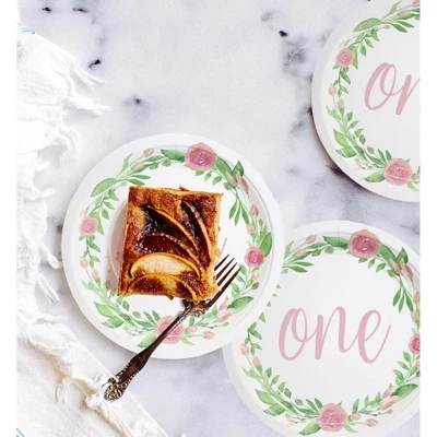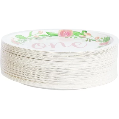 - SERVES 80: Includes enough plates for 80 guests; contains 80 paper plates featuring floral design in a cirlce with “one” in the middle.