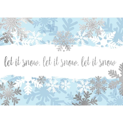 Holiday Foil Printed Greeting Cards – H1706. Greeting Card with Blue Snowflakes and Let It Snow and Silver Snowflakes in Silver Foil. Box Set Has 25 Greeting Cards and 26 Silver Foil Lined Envelopes. The box set is made of a white chipboard base and the lid is a clear vinyl lid and secured to the box to protect the cards and envelopes. Included on the inside bottom panel of each card is a pre-printed verse in black ink stating “May the joys of this Holiday Season carry over into the New Year.”
