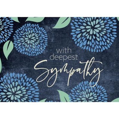 Sympathy Greeting Cards – S2001. Greeting Cards Featuring With Deepest Sympathy Message and Floral Design on a Navy Background. Box Set Has 25 Greeting Cards and 26 Bright White Envelopes. The box set is made of a white chipboard base and the lid is a clear vinyl lid and secured to the box to protect the cards and envelopes. Included on the inside bottom panel of each card is a pre-printed verse in black ink stating โWishing you comfort and peace at this very difficult time.โ