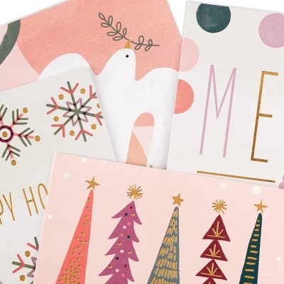Send peaceful wishes to everyone on your list with this bulk pack of Hallmark Upscale Modern Boxed Christmas Cards Assortment by Hallmark. Bulk pack of holiday cards features festive icons such as a dove, snowflakes and Christmas trees in soft hues with shimmering details. Whimsical trees card message: “Merry Christmas to you; May your corner of the world be merry and bright this beautiful season.” Scattered dots card message: “Merry & Bright; Wishing you joy in every moment!” Peace dove card message: “Peace on earth; Happy holidays to you and yours.” Bespoke snowflakes card message: “Happy holidays; And a happy new year, too!” Hallmark has been your family-owned creator of greeting cards, Christmas ornaments, gifts and wrapping paper for more than 100 years. We take deep pride in helping individuals connect in just the right way.