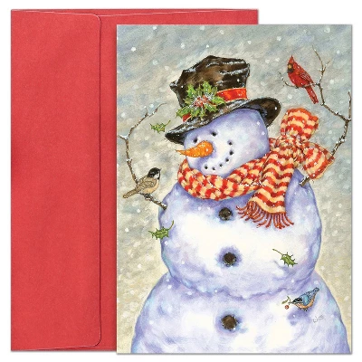 - Charming design shows a trio of birds visiting a classic snowman with scarf and hat