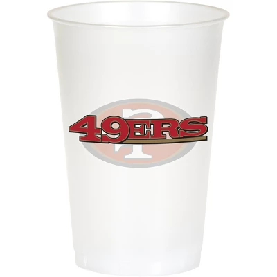 Enthusiastic football fans will believe their beverages taste even better when served in the San Francisco 49ers 20 oz. Plastic Cups which feature the team’s colors and logo. The clear plastic container has the β49ersβ printed on one side and the team logo on the other, making it the ideal cup or snack holder for backyard barbeques, game day viewing or a tailgating event. Sold 24 per package, the cups are easy to combine with matching tableware and decorations from the 49ers officially licensed party supply collection.