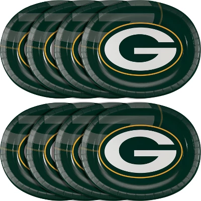Fans will cheer and shout when foods are served on the Green Bay Packers Oval Paper Plates which feature the team’s colors and logo. The sturdy dishes measure 10ā x 12ā and the dark green background is decorated with a giant white āGā that is circled in gold, the perfect paper plate for tailgate barbeques or game day fare. Sold 24 per package, these large disposable plates make the perfect trays for displaying appetizers, cookies, or desserts for fans.