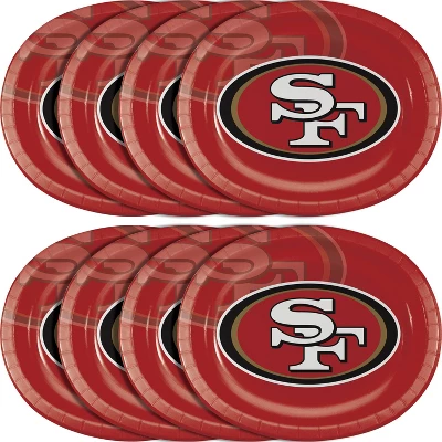 Stack the wonderful San Francisco 49ers Oval Paper Platters at the beginning of the buffet line or on the food table for barbeques and hear fans roar their approval. The sturdy paper plates measure 10” x 12” and the bright red background is decorated with the 49ers team logo, with a faded image of the logo behind the first. Sold 24 per package, the plates make the ideal dish for holding heartier meals or they can be used as trays to pass out appetizers, dessert morsels or party favors to guests.