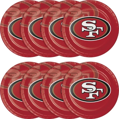 Football season is here and the best way to score points with fans is to serve game day foods on the officially licensed San Francisco 49ers Paper Plates which feature the team’s famous logo and colors. The sturdy 9” round paper plate showcases the 49ers oval shaped logo that contains the overlapping letters “SF”, and it will easily hold tasty ribs, burgers and chips or pizza slices to eat while watching the game live or on television. Sold 24 per package, the disposable plates are easy to pair with matching tableware from the collection or they can be mixed with solid gold or white party supplies for a fun presentation.