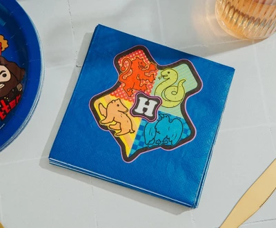 - FUN THEME: Blue plates feature fun chibi-styled Harry Potter characters. Cups depict Hogwart’s castle. Napkins feature the colorful Hogwart’s House Crest.