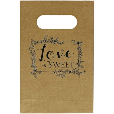 Guests of all ages will light up with joy once they receive a party favor bag full of goodies (goodies not included). These adorable kraft wedding favor gift bags come in a value pack of 50 and are ideal for handing out guest gifts and treats during an upcoming wedding reception. The brown kraft paper treat bags feature die-cut handles. The bags are big enough to hold a variety of goodies such as toys, bubbles, mints, candy, chocolates, or cookies. Each bag comes with floral designs and reads “Love Is Sweet” on the front to remind guests of the love the bride and groom share on their big day!