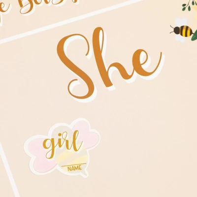Add these “He or “She” voting cards to your gender reveal party decorations. Guests can use the stickers guess what the baby’s gender will be at your baby shower or gender reveal party. Featuring an adorable floral and bee design, this “What Will Baby Bee” prediction card game set will be the perfect addition to the baby shower decorations.